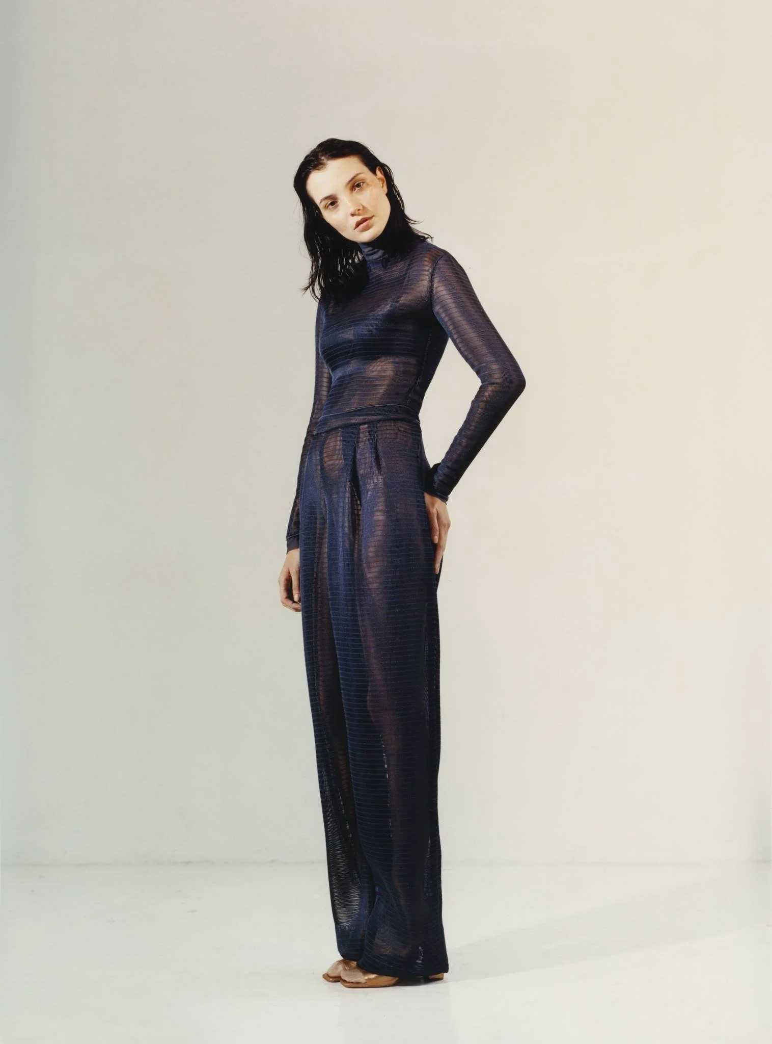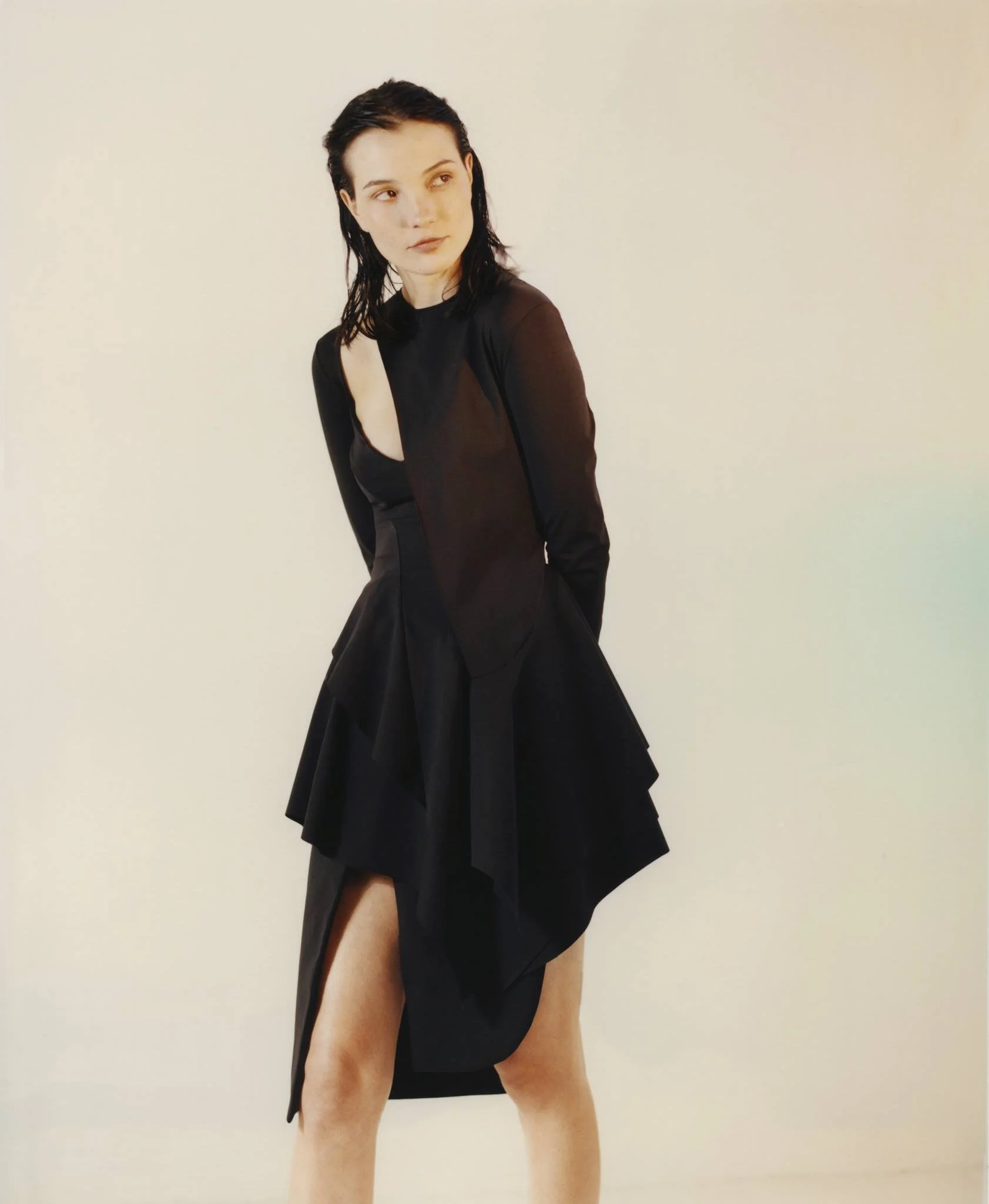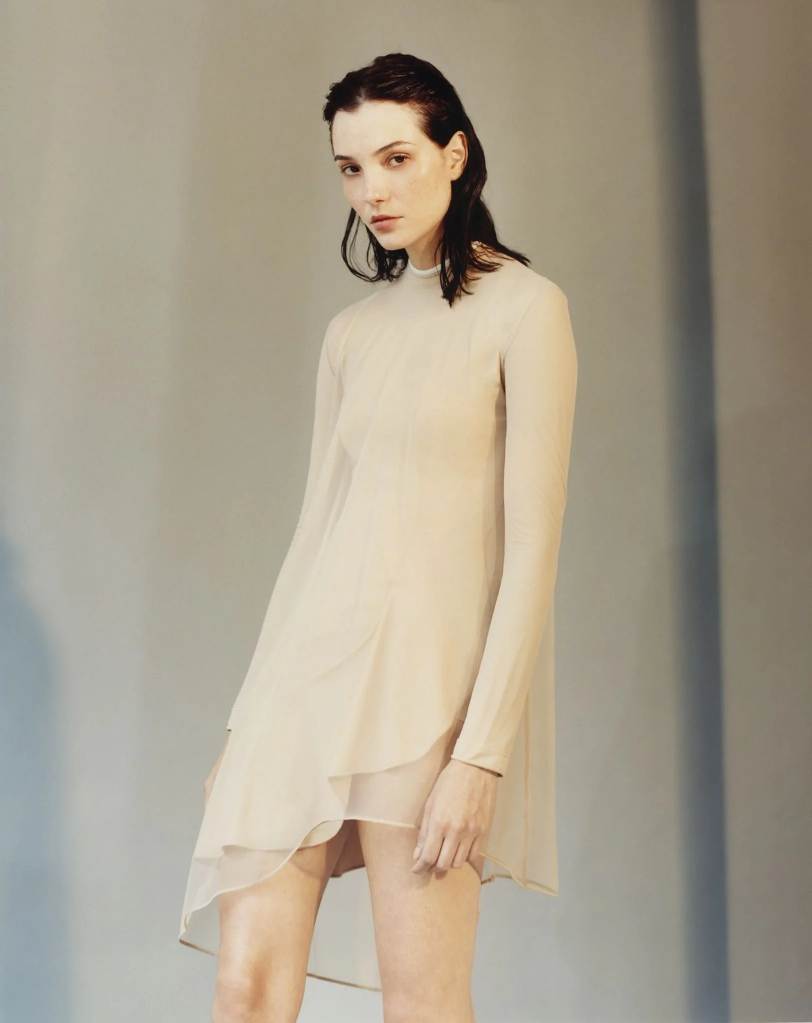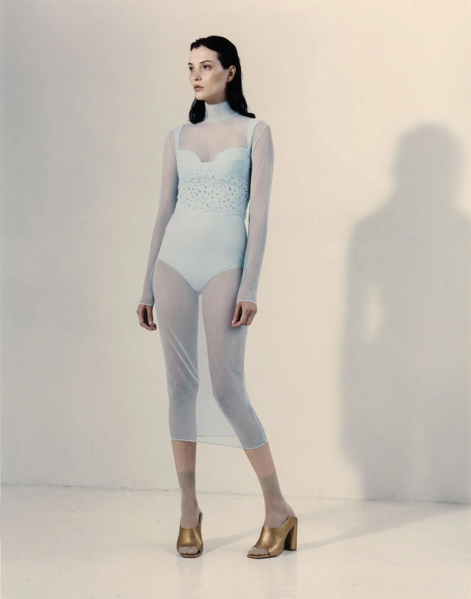 The unlikely collaboration between Maison Lejaby, a prominent figure in high-end French lingerie, and Lea Peckre. The collection is built on a sophisticated use of see-through fabrics, asymmetrical drapes and geometric volumes, and emphasizes feminine silhouettes in a ethereal and seductive way.